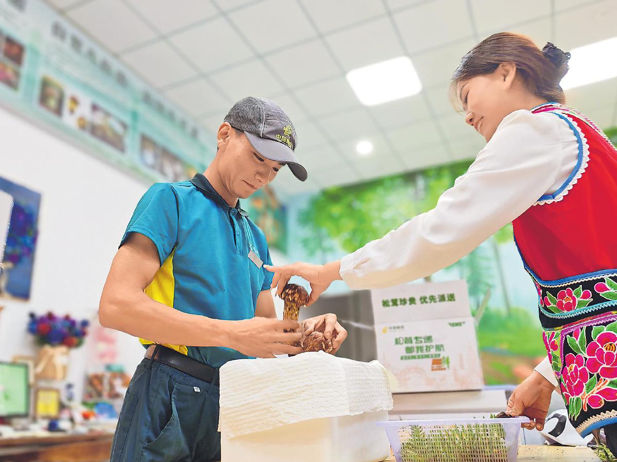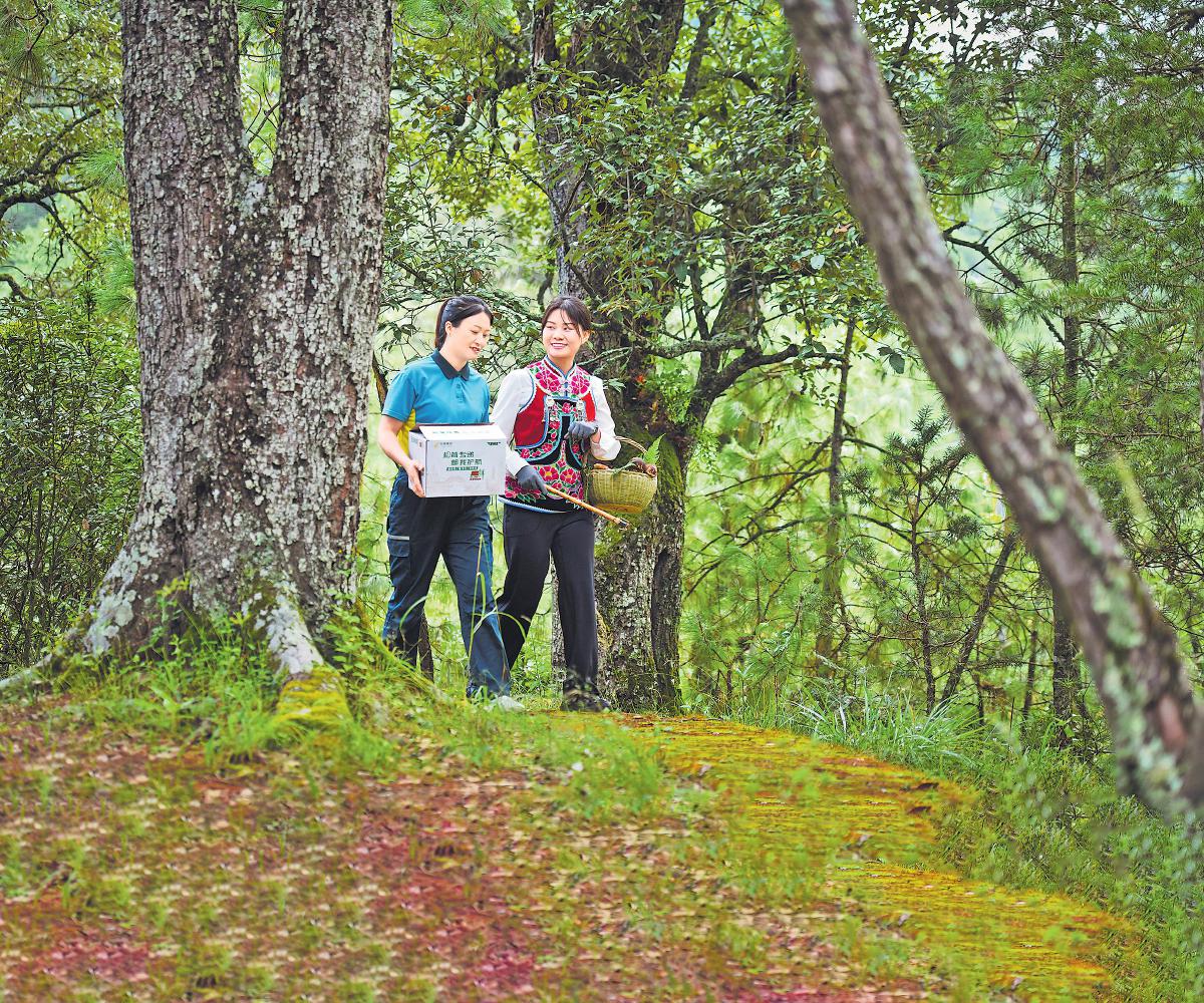 9月17日清晨,楚雄州南华县邮政分公司员工随菌农上山采摘松茸,实现林下至邮路无缝衔接。