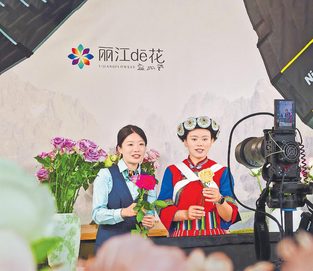 邮政主播与园区花农同框直播,手机屏幕内外同步“带花”,线上订单实时滚动,流量变销量。