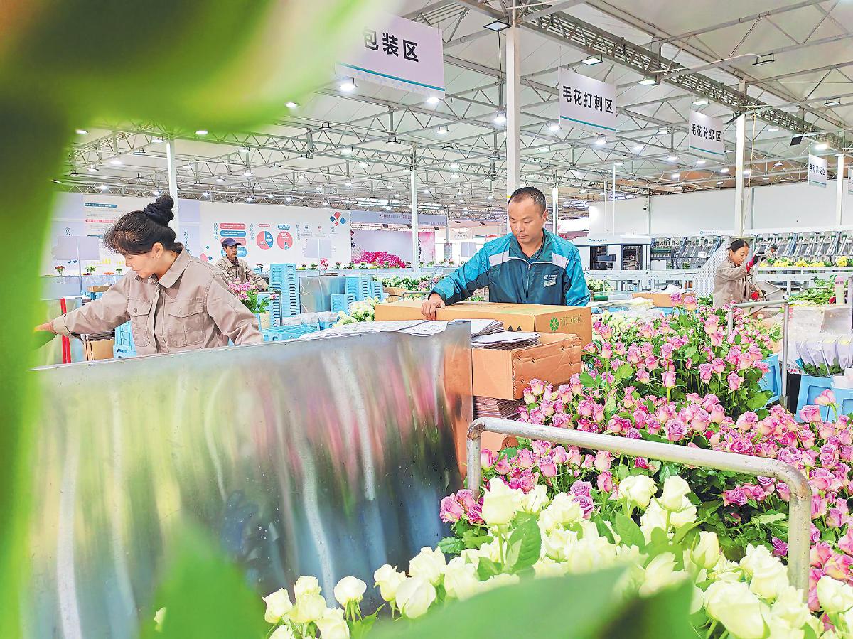 包装台前,工作人员将花束套上吸水纸、装入邮政标准箱,封箱、贴签、扫码,一气呵成。