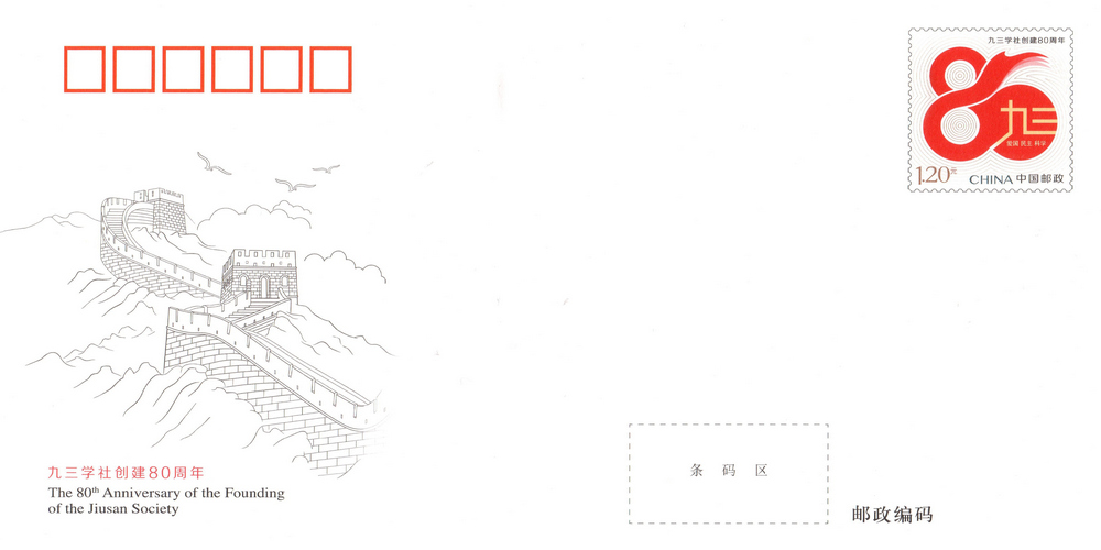 中国邮政定于2025年9月3日发行《九三学社创建80周年》纪念邮资信封1套1枚。详情如下: